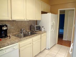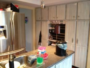 This simple galley kitchen was the previous owners idea of a facelift for selling the house. The new owners wanted something much more modern. New floors in jatoba were dark, but the new white cabinetry, although simple and inexpensive, really made the kitchen bright. Formica counters and a big single apron sink made it into a great space for a cook. The blue ceramic backsplash brought a tropical feel to the space. New appliances were a part of the original plan too, |
