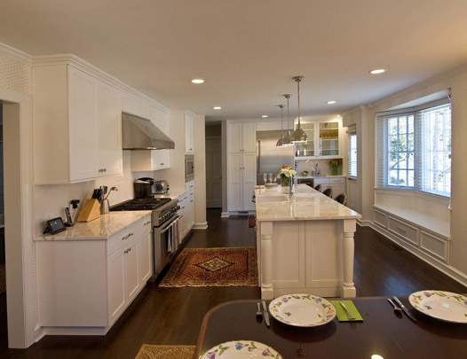 The kitchen in this country ranch was old and out of date. A support wall was removed and a large beam installed in its place to make a more modern open space. A larger window too. New hardwood to match the rest of the house was installed, along with new walnut finish shaker cabinetry. Solid surface countertops and a new island, along with all new appliances really brought everything up to date. New potlights and pendants make this space open and inviting at night. |