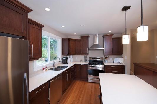 The kitchen in this country ranch was old and out of date. A support wall was removed and a large beam installed in its place to make a more modern open space. A larger window too. New hardwood to match the rest of the house was installed, along with new walnut finish shaker cabinetry. Solid surface countertops and a new island, along with all new appliances really brought everything up to date. New potlights and pendants make this space open and inviting at night. |