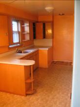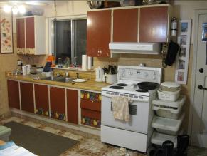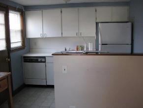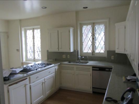 This simple galley kitchen was the previous owners idea of a facelift for selling the house. The new owners wanted something much more modern. New floors in jatoba were dark, but the new white cabinetry, although simple and inexpensive, really made the kitchen bright. Formica counters and a big single apron sink made it into a great space for a cook. The blue ceramic backsplash brought a tropical feel to the space. New appliances were a part of the original plan too, |