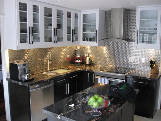 This kitchen was so small it had to be seen to be believed. The old peninsula just made the space unusable. New solid maple cabinetry and glass doors weren’t enough for these folks though. Top of the line stainless steel backsplash tiles, porcelain floor tiles, Blum hardware, extra thick granite and a beautiful Houzer sink were complemented by Bosch and Kitchenaid appliances and gorgeous german made handles and pulls. Every cabinet had every conceivable drawer insert, organizer, and gizmo you could get to make this kitchen a dream space. Even the kickplates had drawers in them. |